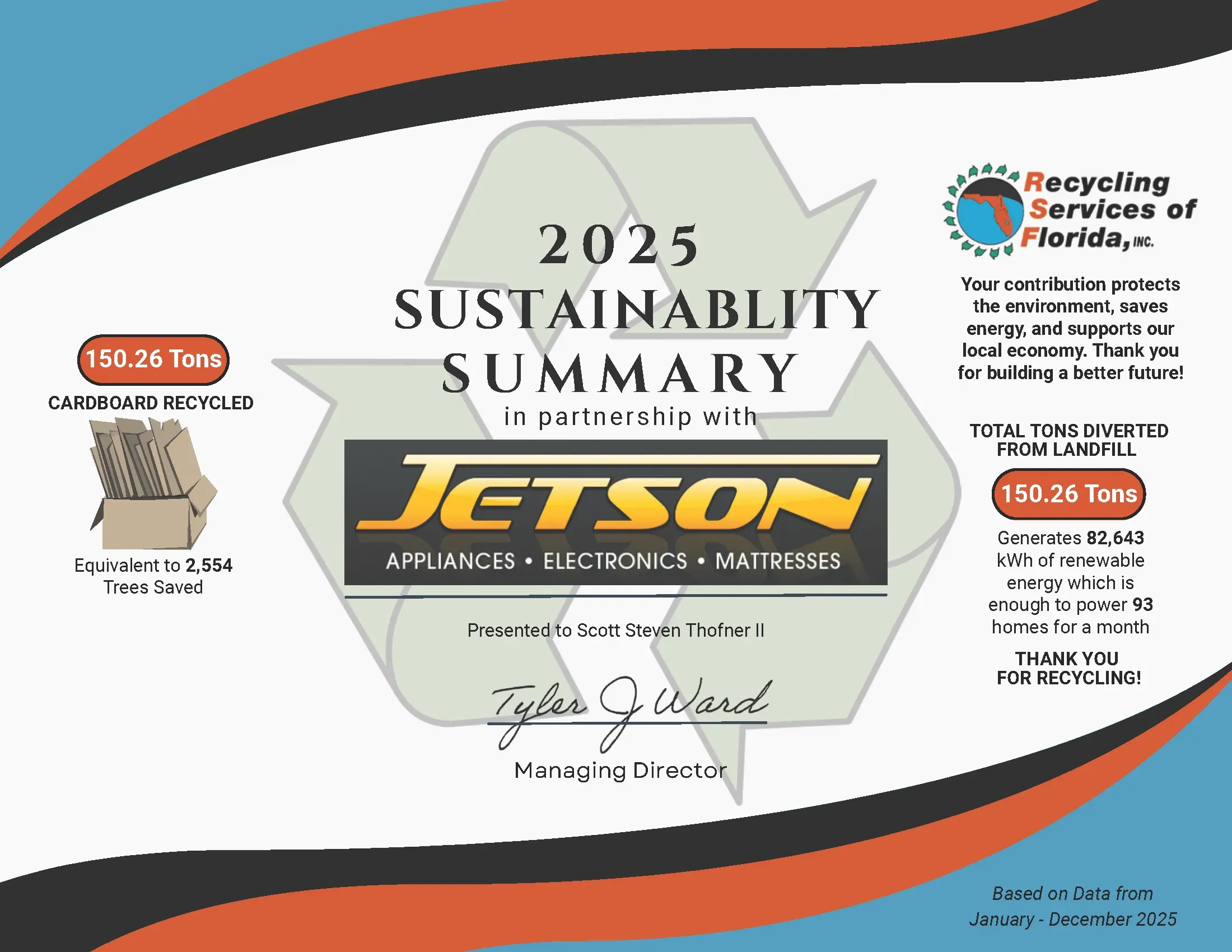 Jetson Appliances, Electronics & Mattresses continues to strengthen its commitment to sustainability through its partnership with Recycling Services of Florida, delivering measurable environmental benefits year over year.